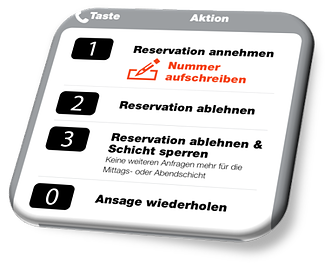 Sobald ein Gast online reserviert und zu diesem Zeitpunkt das Telefon gemäss System besetzt ist (und keine Kontingente definiert sind / Kontingente voll / Kontingent Zeit abgelaufen), wird diese Anfrage per Telefon bei Ihnen eintreffen. Diese Anfrage können Sie dann per Tastenwahl (1 oder 2) ganz einfach akzeptieren oder ablehnen.