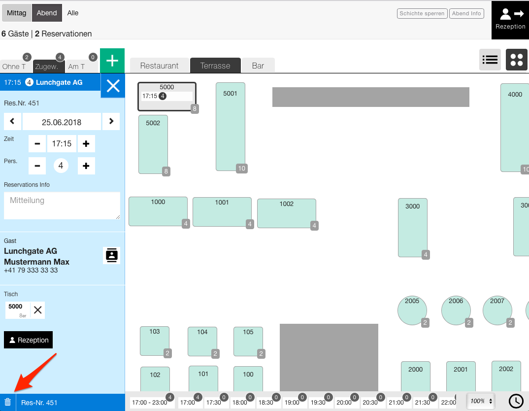 Um eine Reservation zu stornieren, klicken Sie in der Detailansicht auf den Papierkorb. Falls die Reservierung bereits einem Tisch zugewiesen worden ist, wird die Zuweisung nach der Stornierung aufgehoben und die Reservation erscheint auf der linken Seite (durchgestrichen) unter "Ohne Tisch". Sie können eine stornierte Reservation jederzeit wieder reaktivieren.