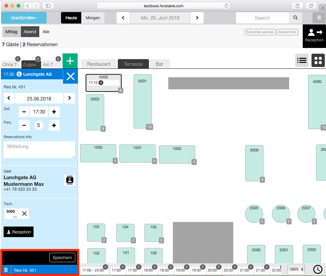 Dazu klicken Sie einfach die gewünschte Reservation an. Sobald sie Änderungen vornehmen, erscheint unten ein "Speichern" Button. Sobald Sie diesen Betätigen werden die Änderungen übernommen und es wird ggf. dem Gast bestätigt (je nach Konfiguration unter "Generell")