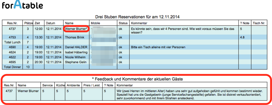 Die Liste enthält neben den Informationen zu der Reservation auch allfällige Feedbacks (=> Feedback-Funktion) und Gästeinfos (=> Gästedatenbank).